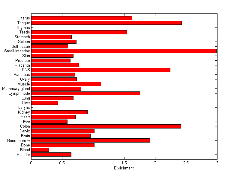 The expression level is normalized with tissue-library size. Each value for a gene in a tissue is a ratio of observed ESTs to the expected one in this tissue. The expected number of ESTs is the product of total ESTs of the gene and the fraction of total ESTs in the tissue among all ESTs in 30 tissues.