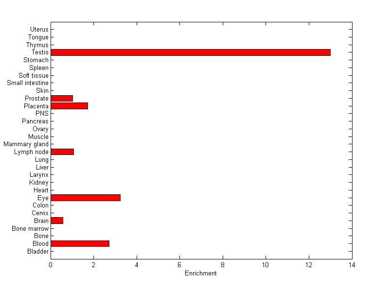 The expression level is normalized with tissue-library size. Each value for a gene in a tissue is a ratio of observed ESTs to the expected one in this tissue. The expected number of ESTs is the product of total ESTs of the gene and the fraction of total ESTs in the tissue among all ESTs in 30 tissues.