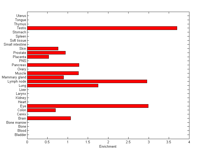 The expression level is normalized with tissue-library size. Each value for a gene in a tissue is a ratio of observed ESTs to the expected one in this tissue. The expected number of ESTs is the product of total ESTs of the gene and the fraction of total ESTs in the tissue among all ESTs in 30 tissues.