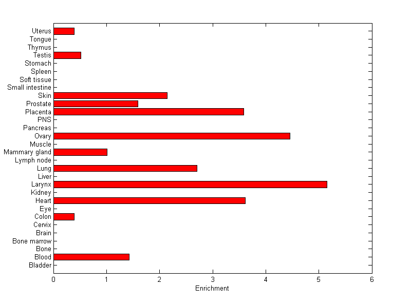 The expression level is normalized with tissue-library size. Each value for a gene in a tissue is a ratio of observed ESTs to the expected one in this tissue. The expected number of ESTs is the product of total ESTs of the gene and the fraction of total ESTs in the tissue among all ESTs in 30 tissues.