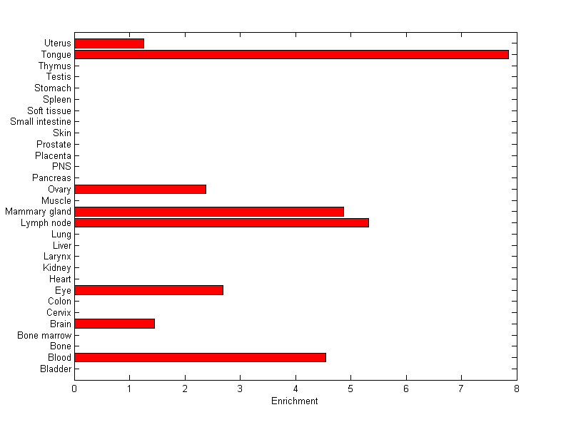 The expression level is normalized with tissue-library size. Each value for a gene in a tissue is a ratio of observed ESTs to the expected one in this tissue. The expected number of ESTs is the product of total ESTs of the gene and the fraction of total ESTs in the tissue among all ESTs in 30 tissues.
