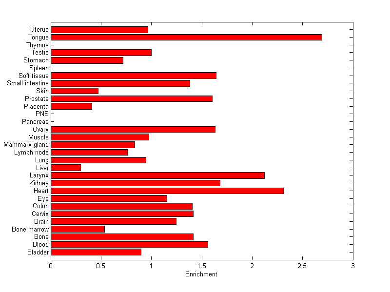 The expression level is normalized with tissue-library size. Each value for a gene in a tissue is a ratio of observed ESTs to the expected one in this tissue. The expected number of ESTs is the product of total ESTs of the gene and the fraction of total ESTs in the tissue among all ESTs in 30 tissues.