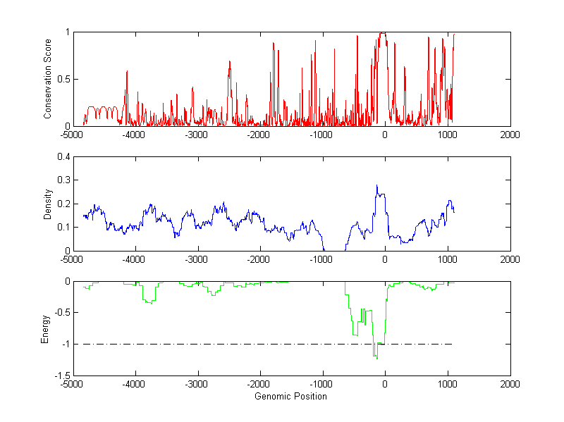 The energy profile (green curve) is about energy for module detection based on TF interaction. The positions with energy less than -1 indicate the existence of CRMs.