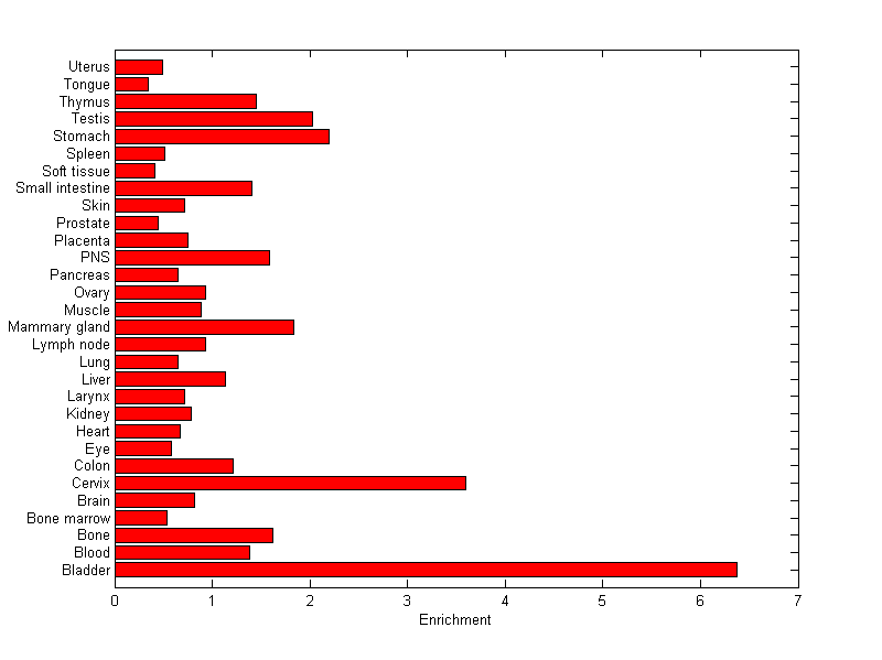 The expression level is normalized with tissue-library size. Each value for a gene in a tissue is a ratio of observed ESTs to the expected one in this tissue. The expected number of ESTs is the product of total ESTs of the gene and the fraction of total ESTs in the tissue among all ESTs in 30 tissues.