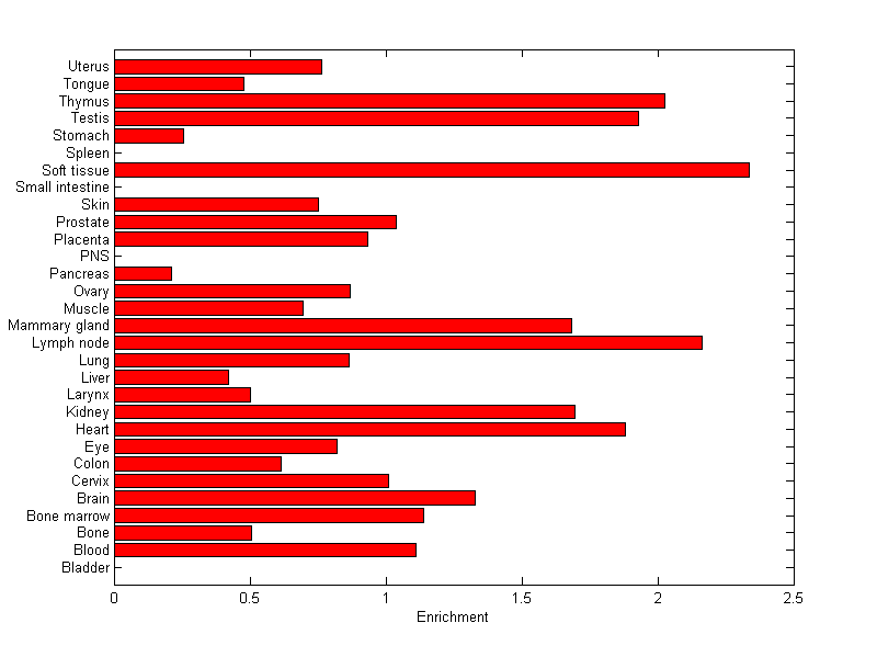 The expression level is normalized with tissue-library size. Each value for a gene in a tissue is a ratio of observed ESTs to the expected one in this tissue. The expected number of ESTs is the product of total ESTs of the gene and the fraction of total ESTs in the tissue among all ESTs in 30 tissues.