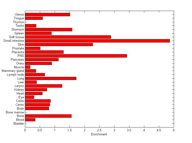 The expression level is normalized with tissue-library size. Each value for a gene in a tissue is a ratio of observed ESTs to the expected one in this tissue. The expected number of ESTs is the product of total ESTs of the gene and the fraction of total ESTs in the tissue among all ESTs in 30 tissues.