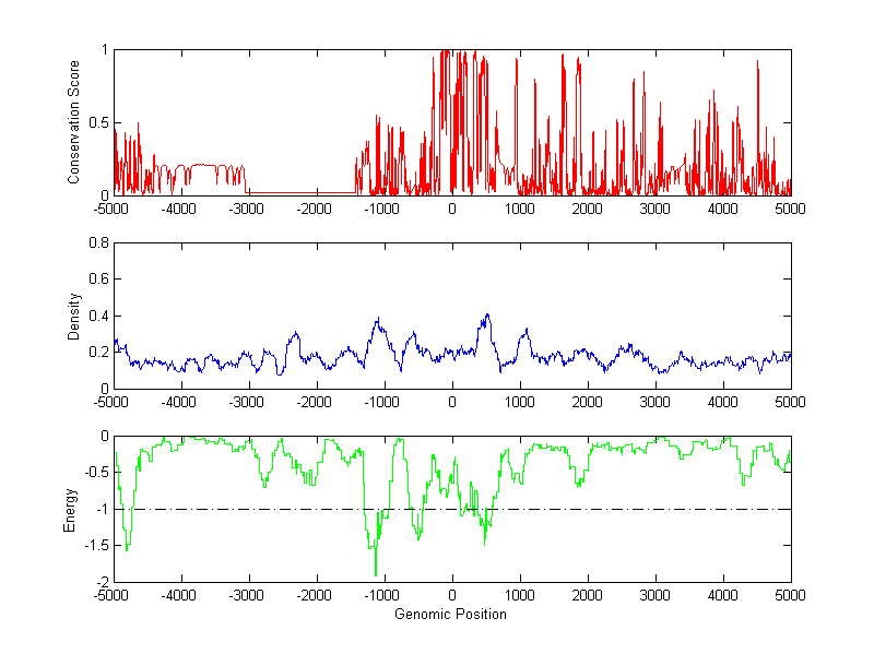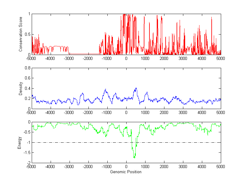The energy profile (green curve) is about energy for module detection based on TF interaction. The positions with energy less than -1 indicate the existence of CRMs.
