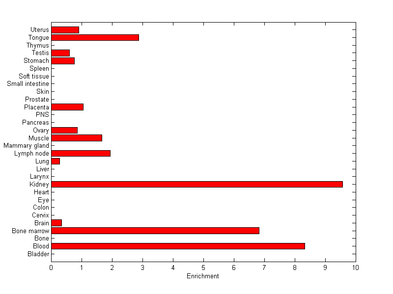 The expression level is normalized with tissue-library size. Each value for a gene in a tissue is a ratio of observed ESTs to the expected one in this tissue. The expected number of ESTs is the product of total ESTs of the gene and the fraction of total ESTs in the tissue among all ESTs in 30 tissues.