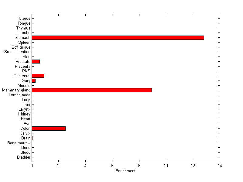 About the profile: The expression level is normalized with tissue-library size. Each value for a gene in a tissue is a ratio of observed ESTs to the expected one in this tissue. The expected number of ESTs is the product of total ESTs of the gene and the fraction of total ESTs in the tissue among all ESTs in 30 tissues. Summary: This gene is preferentially expressed in [mammary_gland, stomach] Download: |