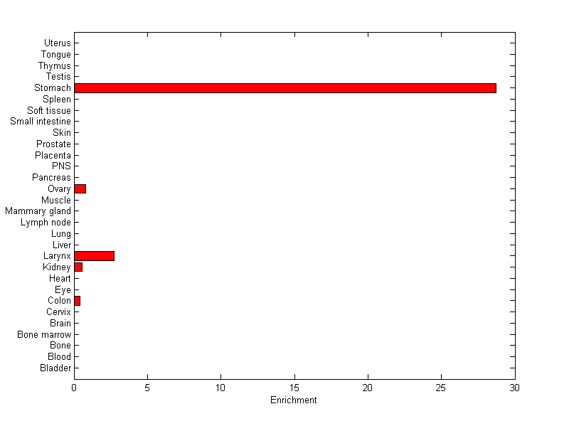 The expression level is normalized with tissue-library size. Each value for a gene in a tissue is a ratio of observed ESTs to the expected one in this tissue. The expected number of ESTs is the product of total ESTs of the gene and the fraction of total ESTs in the tissue among all ESTs in 30 tissues.
