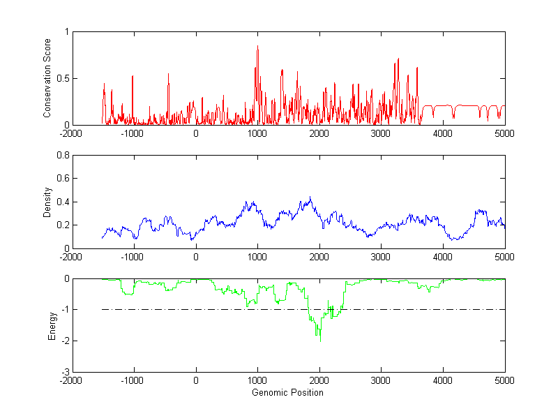 The energy profile (green curve) is about energy for module detection based on TF interaction. The positions with energy less than -1 indicate the existence of CRMs.