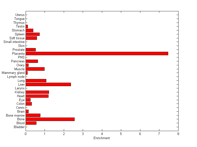 The expression level is normalized with tissue-library size. Each value for a gene in a tissue is a ratio of observed ESTs to the expected one in this tissue. The expected number of ESTs is the product of total ESTs of the gene and the fraction of total ESTs in the tissue among all ESTs in 30 tissues.