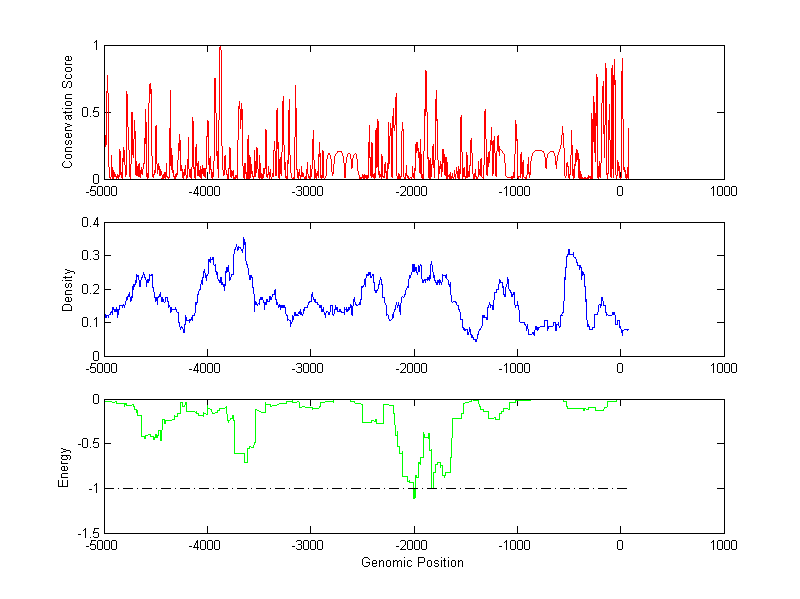 The energy profile (green curve) is about energy for module detection based on TF interaction. The positions with energy less than -1 indicate the existence of CRMs.