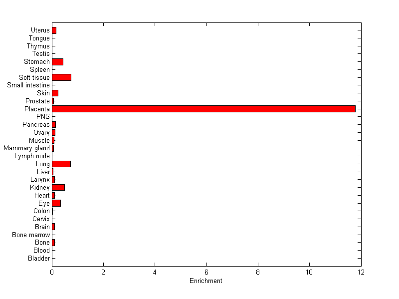 The expression level is normalized with tissue-library size. Each value for a gene in a tissue is a ratio of observed ESTs to the expected one in this tissue. The expected number of ESTs is the product of total ESTs of the gene and the fraction of total ESTs in the tissue among all ESTs in 30 tissues.