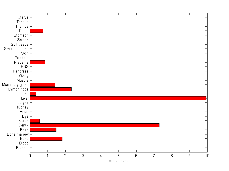 The expression level is normalized with tissue-library size. Each value for a gene in a tissue is a ratio of observed ESTs to the expected one in this tissue. The expected number of ESTs is the product of total ESTs of the gene and the fraction of total ESTs in the tissue among all ESTs in 30 tissues.