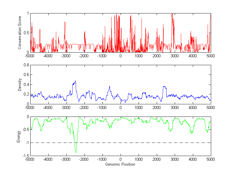 The energy profile (green curve) is about energy for module detection based on TF interaction. The positions with energy less than -1 indicate the existence of CRMs.