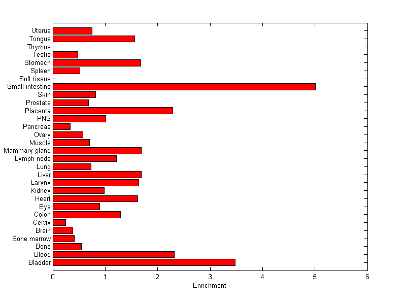 The expression level is normalized with tissue-library size. Each value for a gene in a tissue is a ratio of observed ESTs to the expected one in this tissue. The expected number of ESTs is the product of total ESTs of the gene and the fraction of total ESTs in the tissue among all ESTs in 30 tissues.