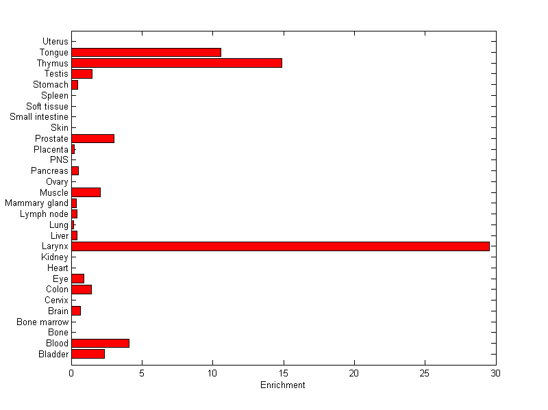 About the profile: The expression level is normalized with tissue-library size. Each value for a gene in a tissue is a ratio of observed ESTs to the expected one in this tissue. The expected number of ESTs is the product of total ESTs of the gene and the fraction of total ESTs in the tissue among all ESTs in 30 tissues. Summary: This gene is preferentially expressed in [larynx, tongue] Download: |
