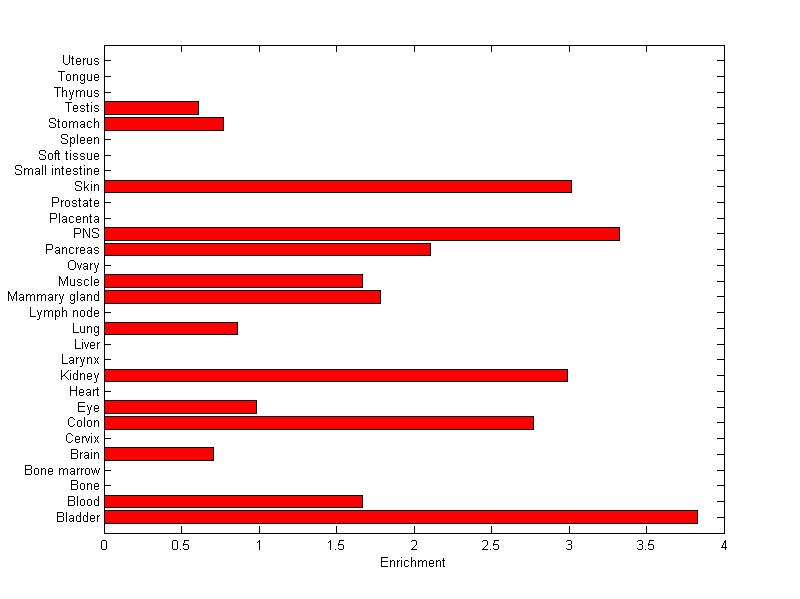 The expression level is normalized with tissue-library size. Each value for a gene in a tissue is a ratio of observed ESTs to the expected one in this tissue. The expected number of ESTs is the product of total ESTs of the gene and the fraction of total ESTs in the tissue among all ESTs in 30 tissues.