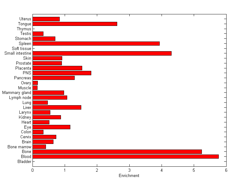About the profile: The expression level is normalized with tissue-library size. Each value for a gene in a tissue is a ratio of observed ESTs to the expected one in this tissue. The expected number of ESTs is the product of total ESTs of the gene and the fraction of total ESTs in the tissue among all ESTs in 30 tissues. Summary: This gene is preferentially expressed in [blood, bone] Download: |