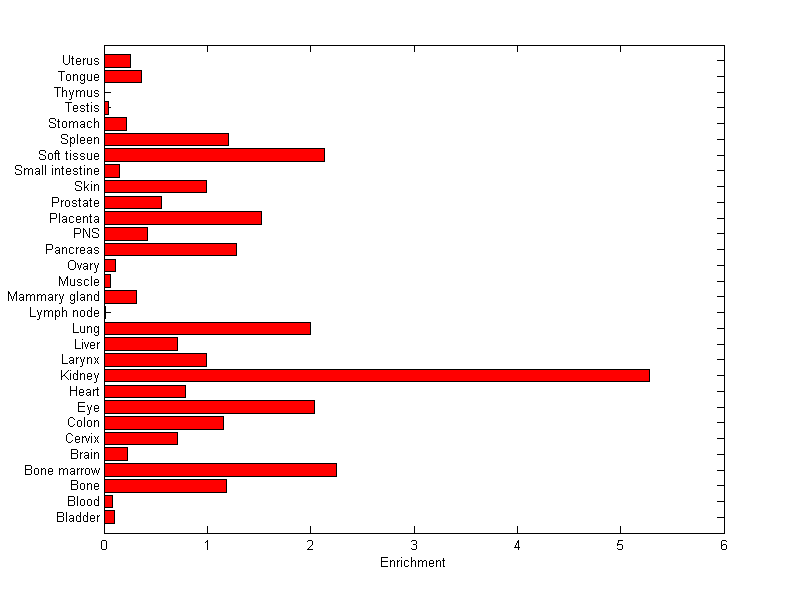 The expression level is normalized with tissue-library size. Each value for a gene in a tissue is a ratio of observed ESTs to the expected one in this tissue. The expected number of ESTs is the product of total ESTs of the gene and the fraction of total ESTs in the tissue among all ESTs in 30 tissues.
