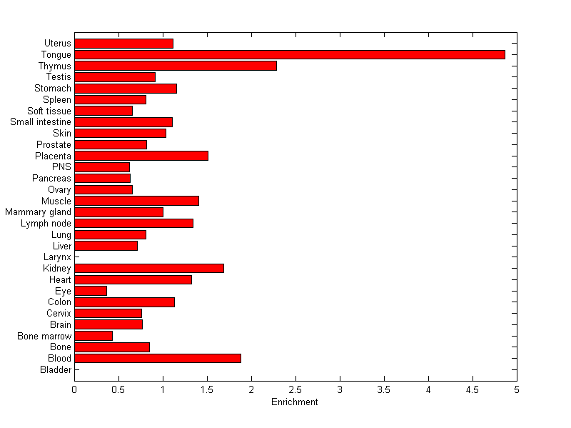The expression level is normalized with tissue-library size. Each value for a gene in a tissue is a ratio of observed ESTs to the expected one in this tissue. The expected number of ESTs is the product of total ESTs of the gene and the fraction of total ESTs in the tissue among all ESTs in 30 tissues.