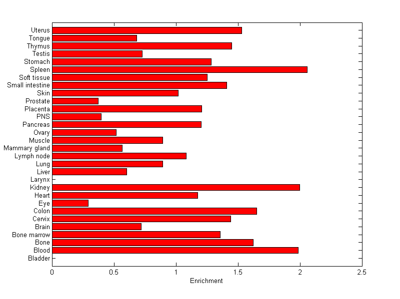 The expression level is normalized with tissue-library size. Each value for a gene in a tissue is a ratio of observed ESTs to the expected one in this tissue. The expected number of ESTs is the product of total ESTs of the gene and the fraction of total ESTs in the tissue among all ESTs in 30 tissues.