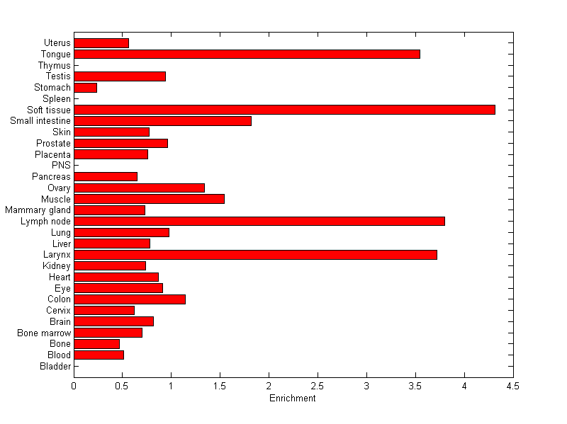 The expression level is normalized with tissue-library size. Each value for a gene in a tissue is a ratio of observed ESTs to the expected one in this tissue. The expected number of ESTs is the product of total ESTs of the gene and the fraction of total ESTs in the tissue among all ESTs in 30 tissues.