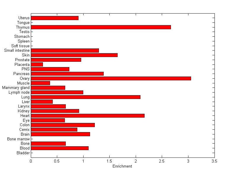 The expression level is normalized with tissue-library size. Each value for a gene in a tissue is a ratio of observed ESTs to the expected one in this tissue. The expected number of ESTs is the product of total ESTs of the gene and the fraction of total ESTs in the tissue among all ESTs in 30 tissues.