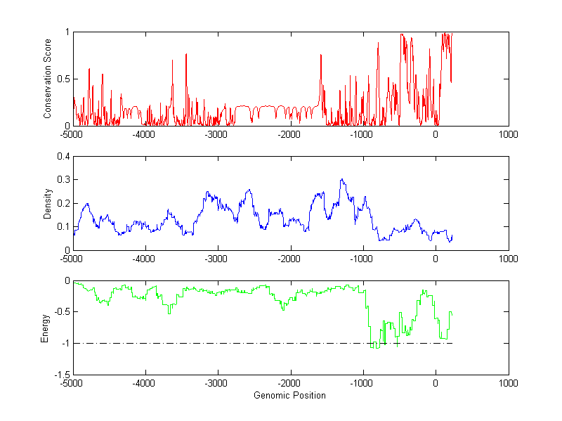 The energy profile (green curve) is about energy for module detection based on TF interaction. The positions with energy less than -1 indicate the existence of CRMs.