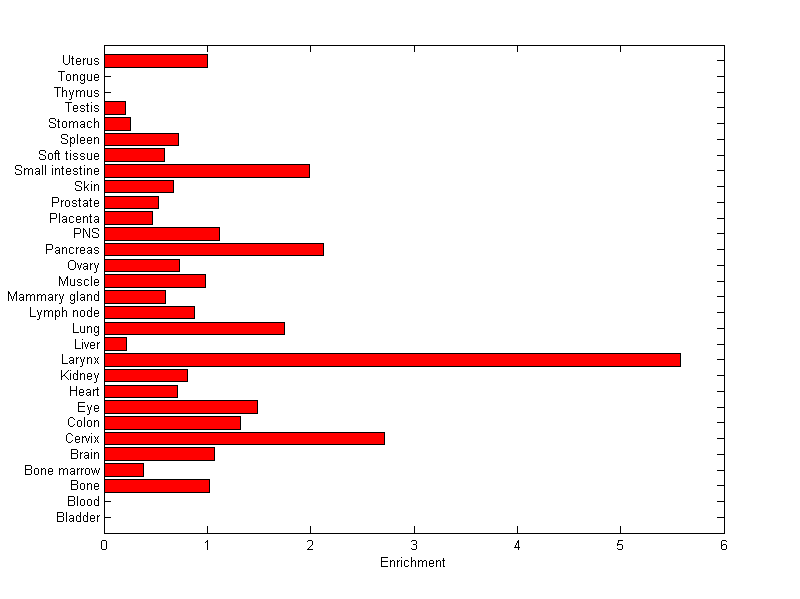 The expression level is normalized with tissue-library size. Each value for a gene in a tissue is a ratio of observed ESTs to the expected one in this tissue. The expected number of ESTs is the product of total ESTs of the gene and the fraction of total ESTs in the tissue among all ESTs in 30 tissues.