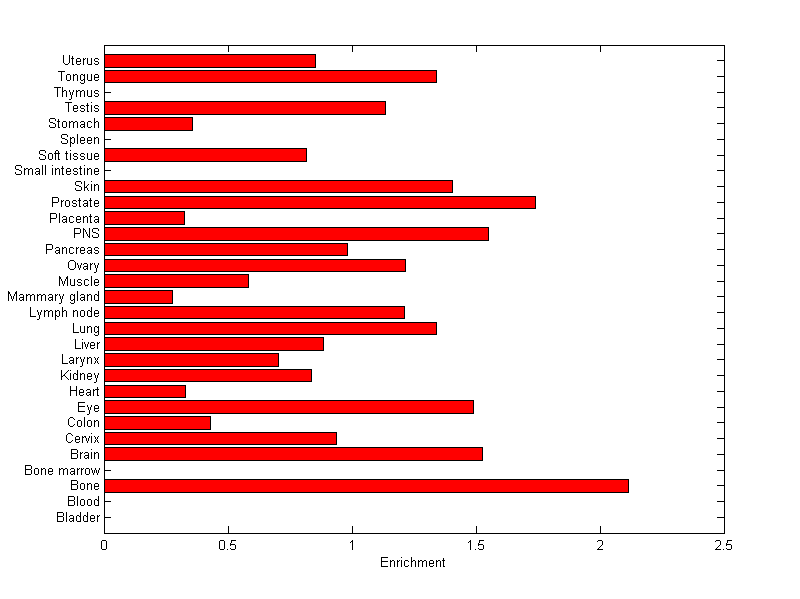 The expression level is normalized with tissue-library size. Each value for a gene in a tissue is a ratio of observed ESTs to the expected one in this tissue. The expected number of ESTs is the product of total ESTs of the gene and the fraction of total ESTs in the tissue among all ESTs in 30 tissues.