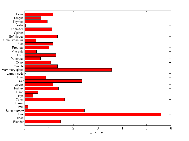 The expression level is normalized with tissue-library size. Each value for a gene in a tissue is a ratio of observed ESTs to the expected one in this tissue. The expected number of ESTs is the product of total ESTs of the gene and the fraction of total ESTs in the tissue among all ESTs in 30 tissues.