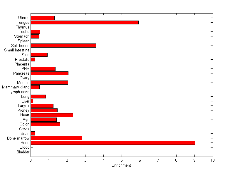 About the profile: The expression level is normalized with tissue-library size. Each value for a gene in a tissue is a ratio of observed ESTs to the expected one in this tissue. The expected number of ESTs is the product of total ESTs of the gene and the fraction of total ESTs in the tissue among all ESTs in 30 tissues. Summary: This gene is preferentially expressed in [bone, tongue] Download: |