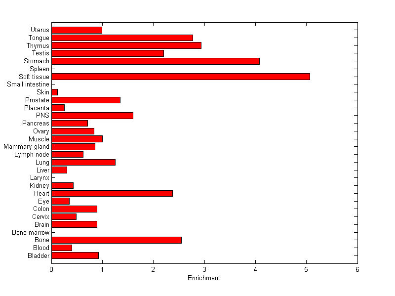The expression level is normalized with tissue-library size. Each value for a gene in a tissue is a ratio of observed ESTs to the expected one in this tissue. The expected number of ESTs is the product of total ESTs of the gene and the fraction of total ESTs in the tissue among all ESTs in 30 tissues.