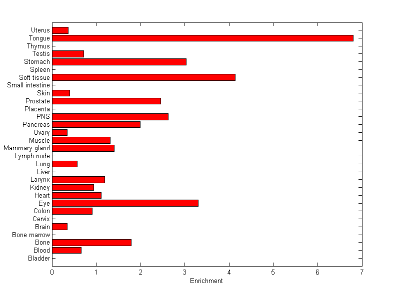 About the profile: The expression level is normalized with tissue-library size. Each value for a gene in a tissue is a ratio of observed ESTs to the expected one in this tissue. The expected number of ESTs is the product of total ESTs of the gene and the fraction of total ESTs in the tissue among all ESTs in 30 tissues. Summary: This gene is preferentially expressed in [tongue] Download: |