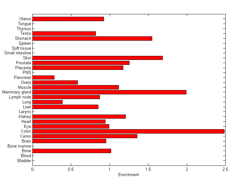The expression level is normalized with tissue-library size. Each value for a gene in a tissue is a ratio of observed ESTs to the expected one in this tissue. The expected number of ESTs is the product of total ESTs of the gene and the fraction of total ESTs in the tissue among all ESTs in 30 tissues.