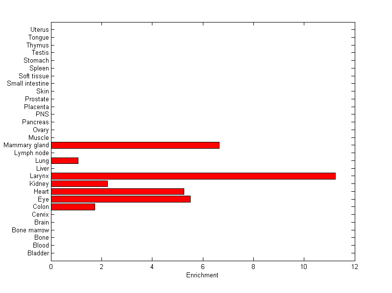 The expression level is normalized with tissue-library size. Each value for a gene in a tissue is a ratio of observed ESTs to the expected one in this tissue. The expected number of ESTs is the product of total ESTs of the gene and the fraction of total ESTs in the tissue among all ESTs in 30 tissues.