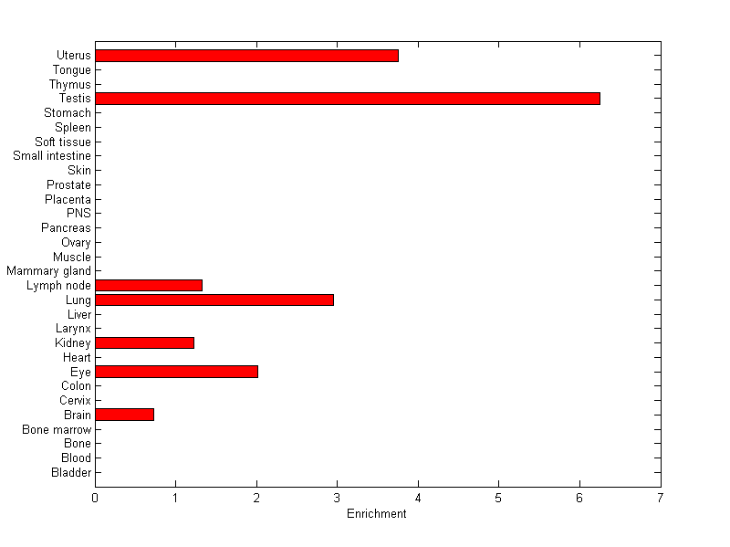 The expression level is normalized with tissue-library size. Each value for a gene in a tissue is a ratio of observed ESTs to the expected one in this tissue. The expected number of ESTs is the product of total ESTs of the gene and the fraction of total ESTs in the tissue among all ESTs in 30 tissues.