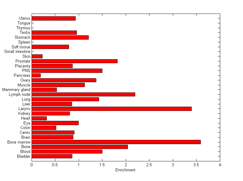 The expression level is normalized with tissue-library size. Each value for a gene in a tissue is a ratio of observed ESTs to the expected one in this tissue. The expected number of ESTs is the product of total ESTs of the gene and the fraction of total ESTs in the tissue among all ESTs in 30 tissues.