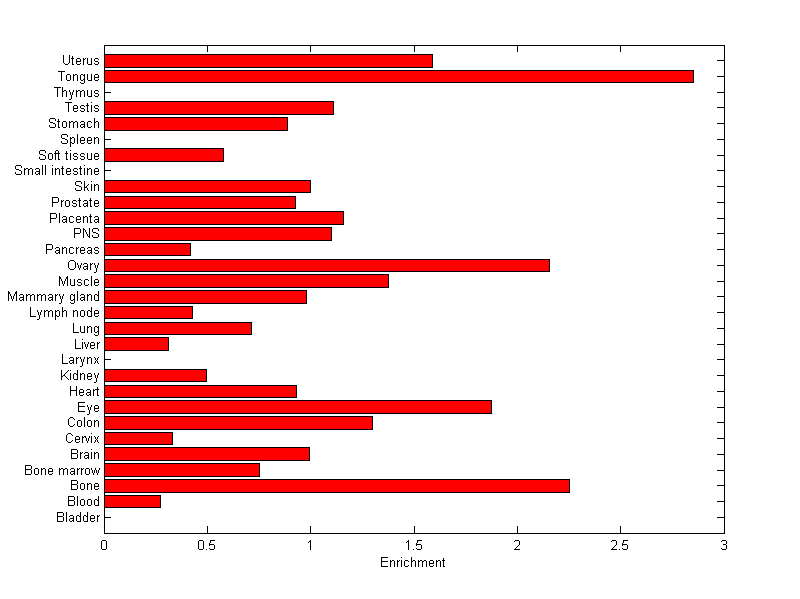 The expression level is normalized with tissue-library size. Each value for a gene in a tissue is a ratio of observed ESTs to the expected one in this tissue. The expected number of ESTs is the product of total ESTs of the gene and the fraction of total ESTs in the tissue among all ESTs in 30 tissues.