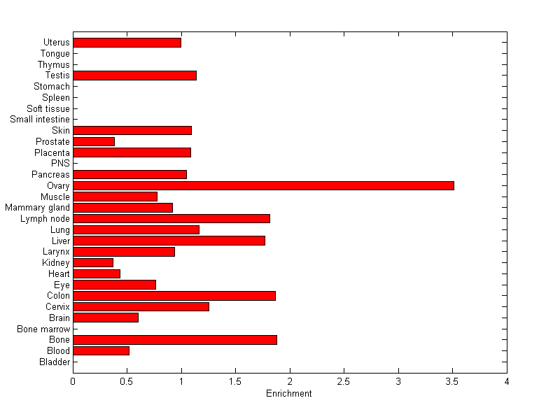 The expression level is normalized with tissue-library size. Each value for a gene in a tissue is a ratio of observed ESTs to the expected one in this tissue. The expected number of ESTs is the product of total ESTs of the gene and the fraction of total ESTs in the tissue among all ESTs in 30 tissues.