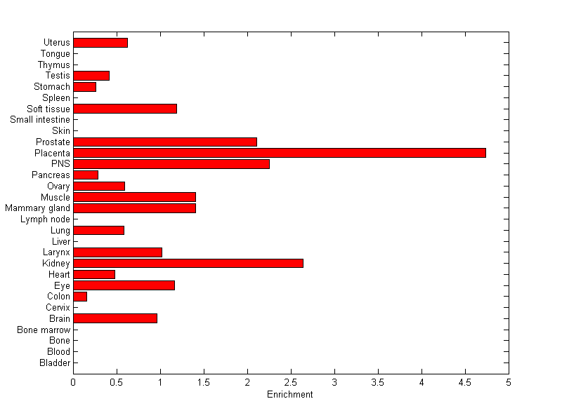 The expression level is normalized with tissue-library size. Each value for a gene in a tissue is a ratio of observed ESTs to the expected one in this tissue. The expected number of ESTs is the product of total ESTs of the gene and the fraction of total ESTs in the tissue among all ESTs in 30 tissues.