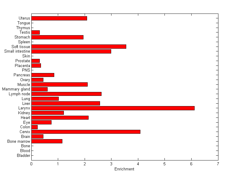 The expression level is normalized with tissue-library size. Each value for a gene in a tissue is a ratio of observed ESTs to the expected one in this tissue. The expected number of ESTs is the product of total ESTs of the gene and the fraction of total ESTs in the tissue among all ESTs in 30 tissues.