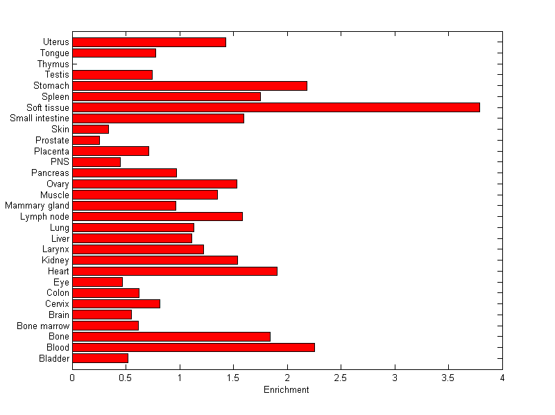 The expression level is normalized with tissue-library size. Each value for a gene in a tissue is a ratio of observed ESTs to the expected one in this tissue. The expected number of ESTs is the product of total ESTs of the gene and the fraction of total ESTs in the tissue among all ESTs in 30 tissues.
