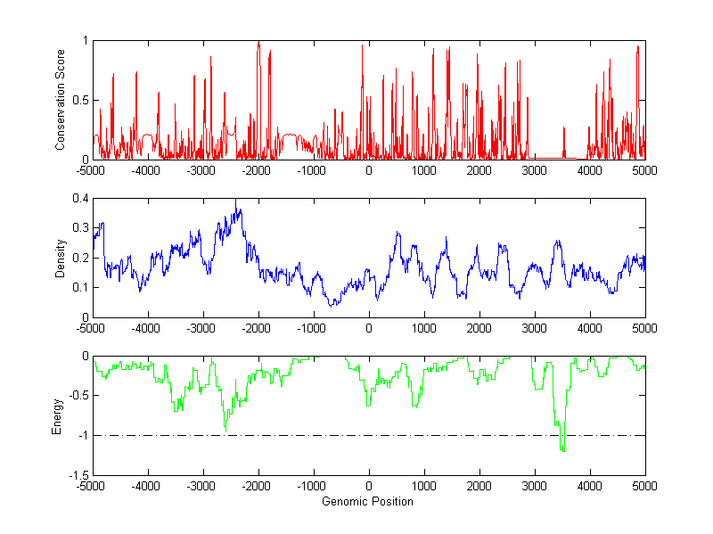 The energy profile (green curve) is about energy for module detection based on TF interaction. The positions with energy less than -1 indicate the existence of CRMs.