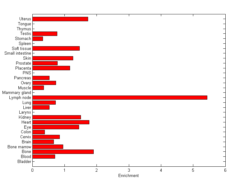 The expression level is normalized with tissue-library size. Each value for a gene in a tissue is a ratio of observed ESTs to the expected one in this tissue. The expected number of ESTs is the product of total ESTs of the gene and the fraction of total ESTs in the tissue among all ESTs in 30 tissues.