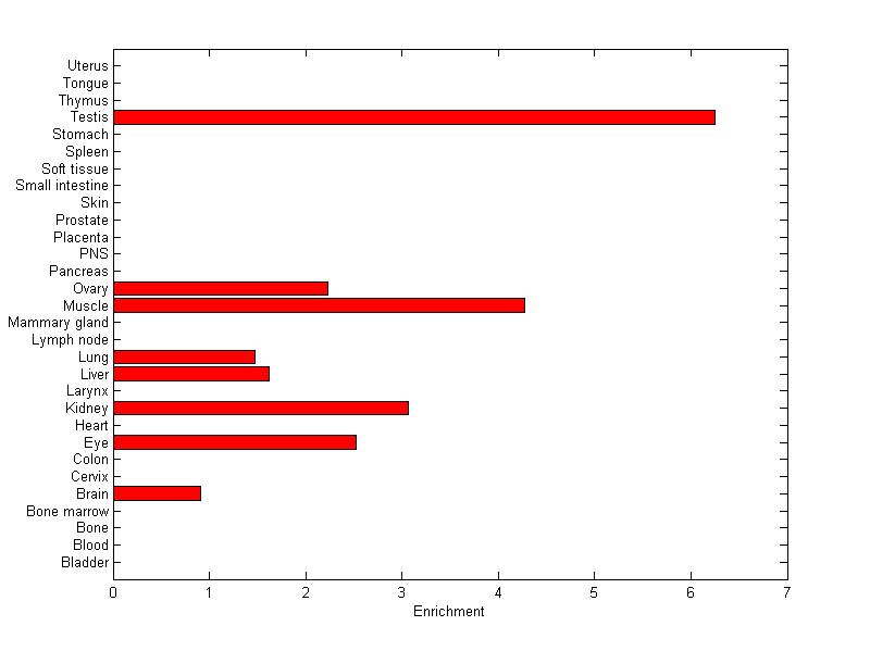 The expression level is normalized with tissue-library size. Each value for a gene in a tissue is a ratio of observed ESTs to the expected one in this tissue. The expected number of ESTs is the product of total ESTs of the gene and the fraction of total ESTs in the tissue among all ESTs in 30 tissues.