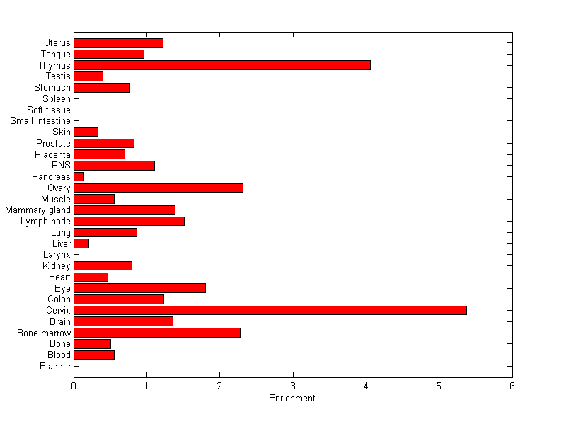 The expression level is normalized with tissue-library size. Each value for a gene in a tissue is a ratio of observed ESTs to the expected one in this tissue. The expected number of ESTs is the product of total ESTs of the gene and the fraction of total ESTs in the tissue among all ESTs in 30 tissues.