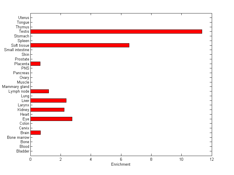 The expression level is normalized with tissue-library size. Each value for a gene in a tissue is a ratio of observed ESTs to the expected one in this tissue. The expected number of ESTs is the product of total ESTs of the gene and the fraction of total ESTs in the tissue among all ESTs in 30 tissues.